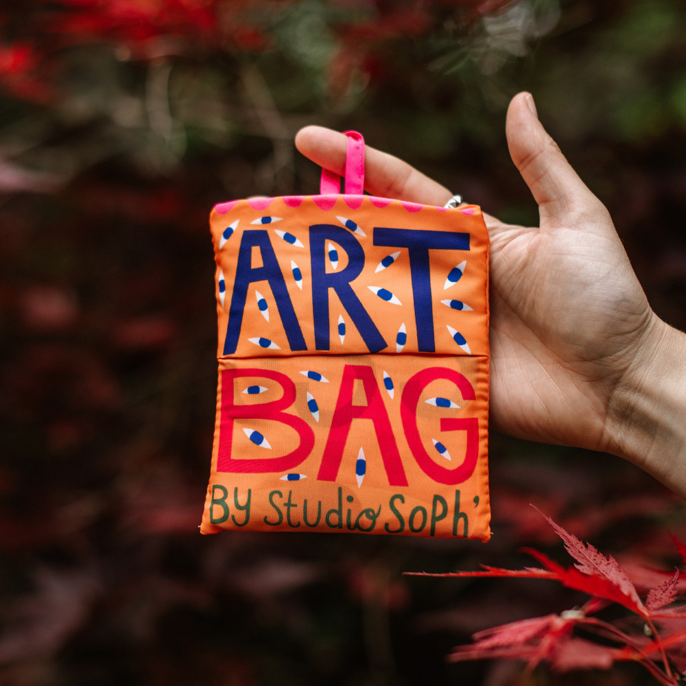 Introducing our eco-friendly, reusable foldable bag, crafted from recycled plastic bottles. This stylish and sustainable accessory features unique art on the front, blending function with creativity. Perfect for shopping, carrying essentials, or as a handy extra bag on the go, it folds neatly for easy storage and helps reduce waste while showcasing your commitment to a greener planet.