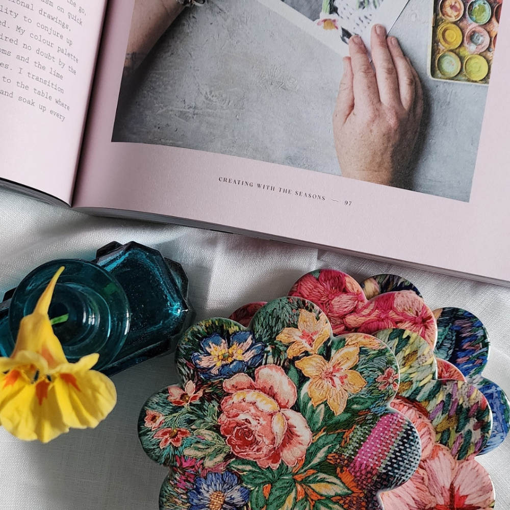 4 assorted ceramic coasters featuring the close up embroidered detail of Fleur's original artwork "Meadow"