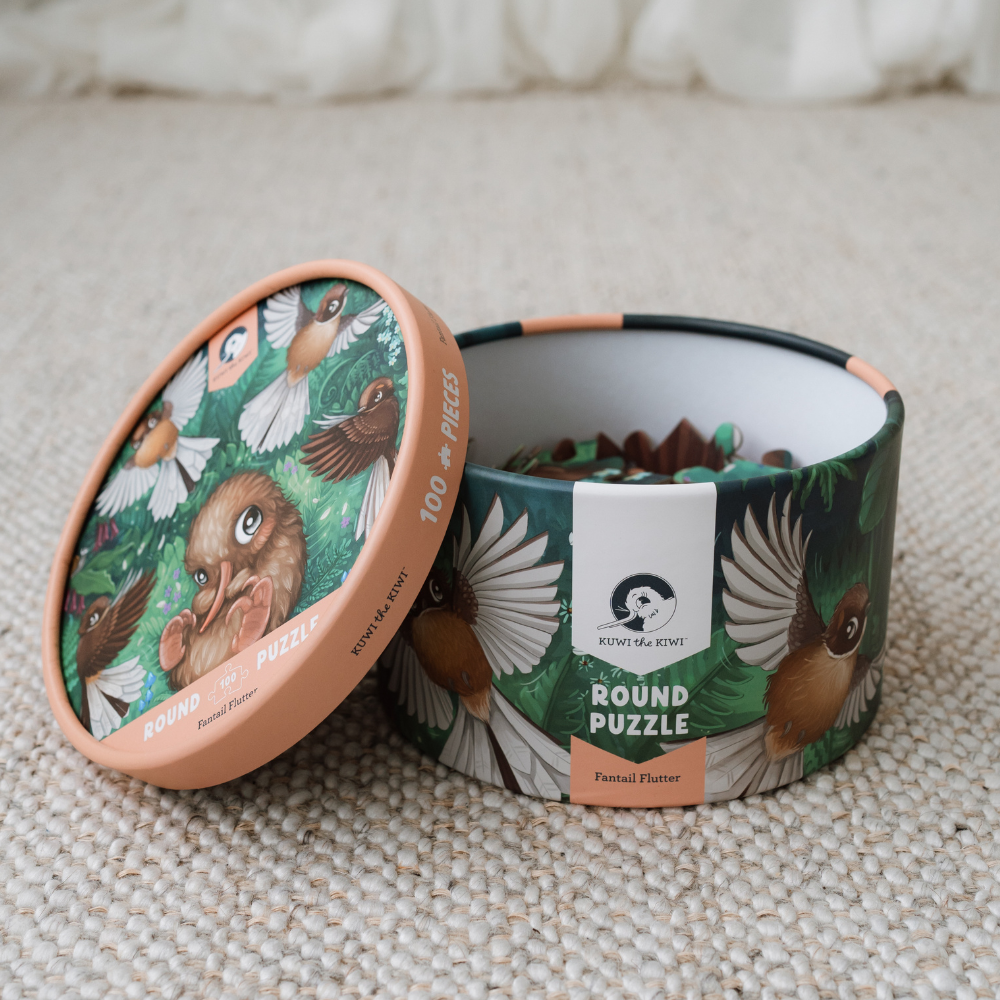 'Fantail Flurry' features artwork from the bestselling Kuwi the Kiwi book 'Kuwi's Fluey Huwi'.